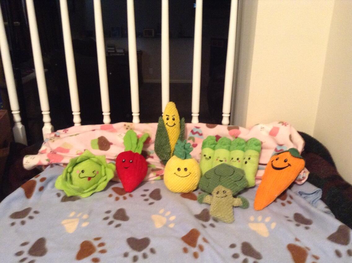 Mom also got her some veggie toys and she seems to love them and is working her little Corgi brain to the max memorizing each veggie and working on recall (we hope to have a video of her up soon fetching each veggie as they are called out)